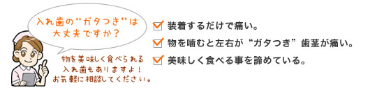 合わない入れ歯は、よく噛むことが出来ません。しっかり噛む事は、唾液が分泌され消化を助けます。また、脳の活性化に繋がります。入れ歯が気になって、会話が弾まなかったり、口元を手で隠していては楽しめません。入れ歯の種類はとても豊富です。患者様のお口の中の状態、生活環境や生活習慣を考慮し、最適だと思われる入れ歯を選んで頂き、毎日美味しく食事を食べ、心おきなく会話を楽しんでいただく事をお勧めします。入れ歯は、衛生的に保つためにも毎日のお手入れは大切です。長年経ちますと歯茎が痩せてくる場合もありますので、定期検診をお勧めします。