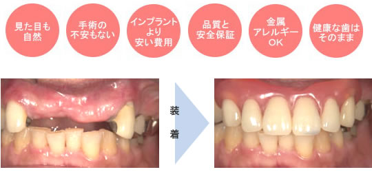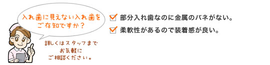 残っている歯に引っ掛けるバネがないので、残っている歯にも負担がかからず、取り外しも簡単です。バネによる入れ歯は、バネのかかった歯に負担がかかり、グラグラさせたり、汚れがつきやすく虫歯の原因になります。また、バネがないので、見た目が自然で若々しい口元になります。