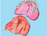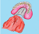 入れ歯側に磁石を埋め込みます。磁石と磁性金属が吸着して、入れ歯を固定します。 | ![]() |