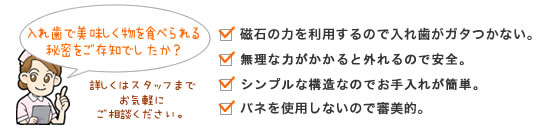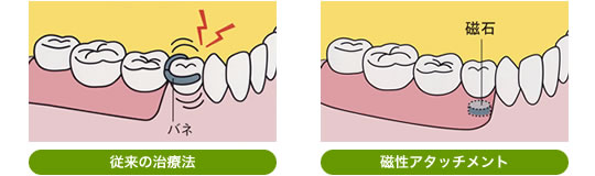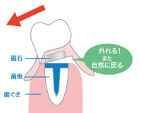 残っている"数本の歯"と装着する"入れ歯"に専用の磁石を取り付け入れ歯を安定させる方法です。磁石の大きさは米粒より小さく、安全性と耐久性があります。磁石は強い吸着力を持っていますが、横からの無理な力がかかると外れるようになっているので、歯根にとてもやさしい構造です。 |