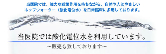 消毒の管理高圧蒸気滅菌、消毒薬、EO水(酸化電位水)を使用し、院内感染をおこさないよう心がけております。 |