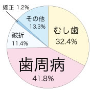 歯を失う原因の第1位は「歯周病」です! 成人の約80%以上が歯周病と言われています。また、若年層の5〜14歳の36%、15〜24歳では65%が歯周病になっています。中高年だけではなく、誰でもかかりやすい病気なのです。歯周病や虫歯の原因となる、歯石やバイオフィルムは歯科の専門的な器具でなければ取り除くことが出来ません。 |