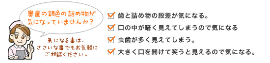 銀歯が気になる方は、白い材料の詰め物にすることで色調や透明感を再現し、天然歯のような自然な美しさが蘇ります。素材は、セラミック(陶器)を使用しています。ほとんど変色しません。唾液の吸収がなく、変色や口臭の心配もありません。金属ではありませんので、金属アレルギーの方でも安心です。