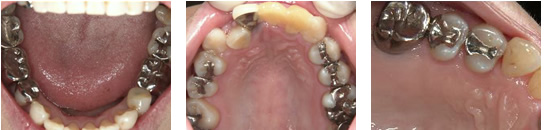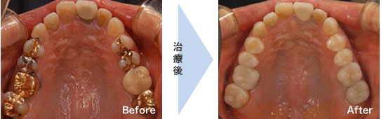 奥歯に入っている金属の被せ物や詰め物がこれにあたります。物を噛む機能的には問題ありませんが、永年の使用で黒く変色することもあり、保険外の歯に比べると形態やフィット(適合)などの精度の面でも劣ります。また金属アレルギーの原因になる事もあります。