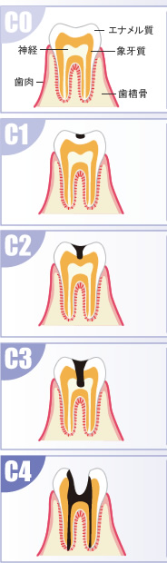 虫歯は進行状況によって、C0〜 C4の5段階に分けられます。