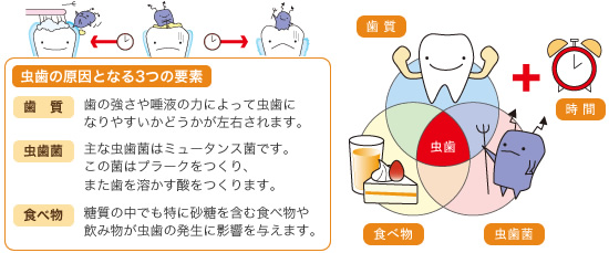 虫歯は、歯質・細菌・食べ物の3つの要素に時間の経過が加わってできると言われています。